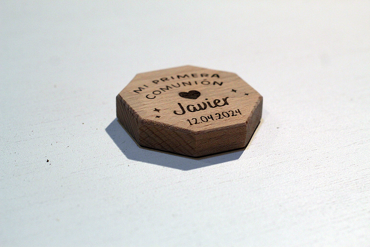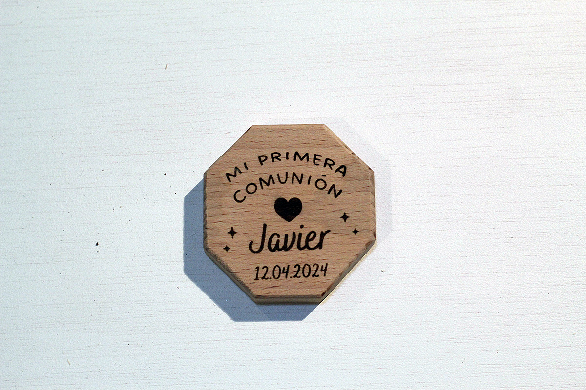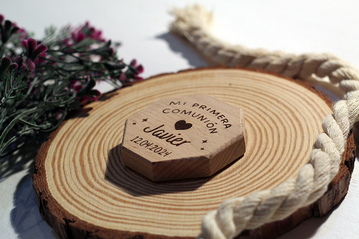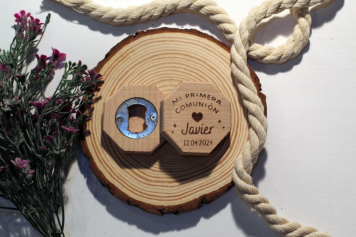 Encontrar un detalle de comunión para los adultos que sea bonito y útil a la vez no es fácil. Este abrebotellas cumple con todo: es una pieza de artesanía en madera, tiene un diseño emotivo con un corazón y, además, es un práctico imán para la nevera. Tus invitados lo usarán a diario y recordarán este día especial.