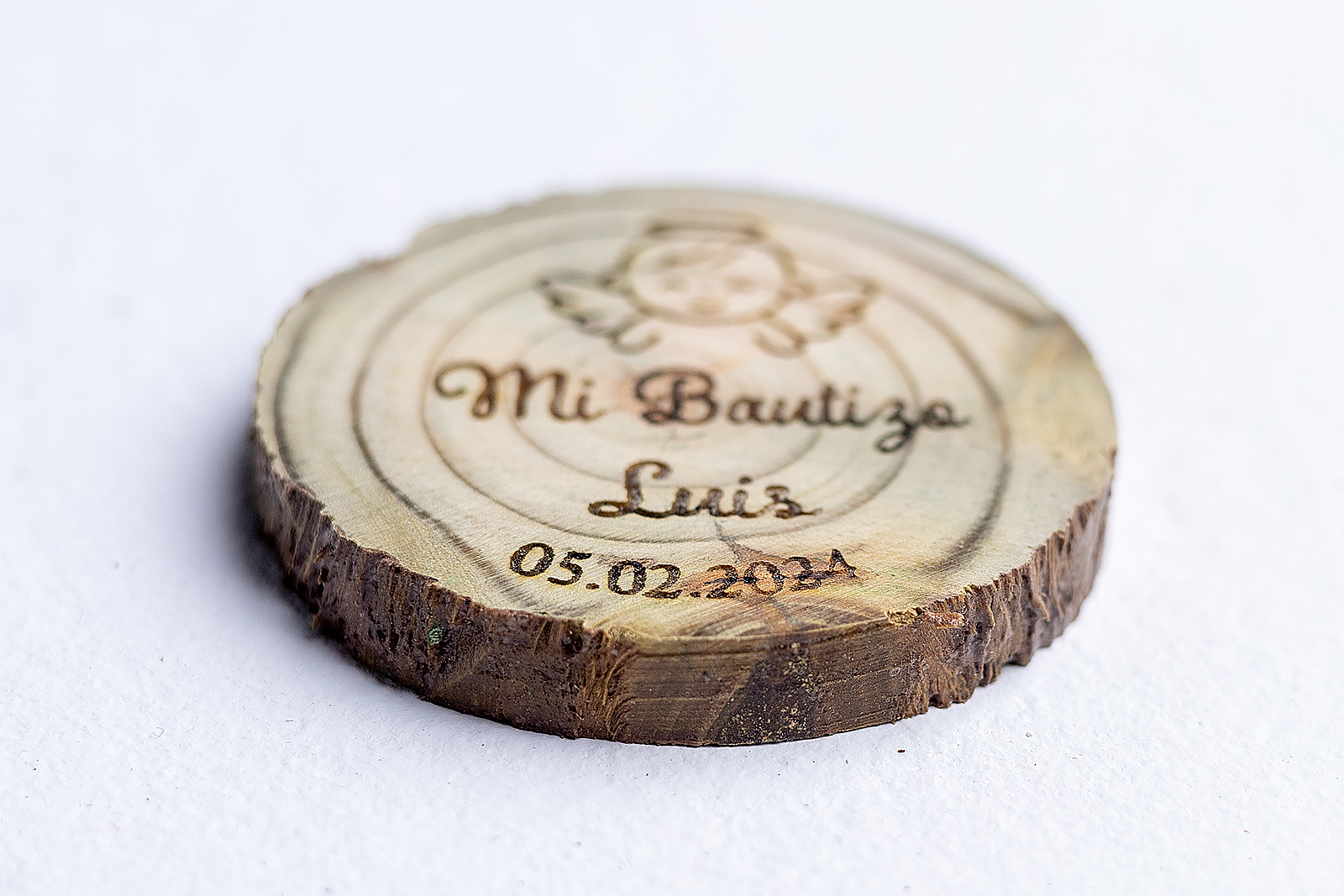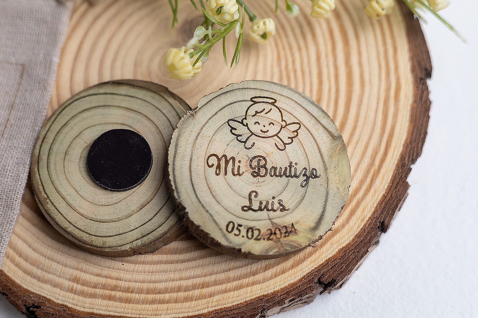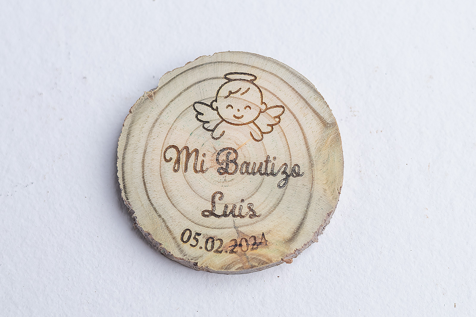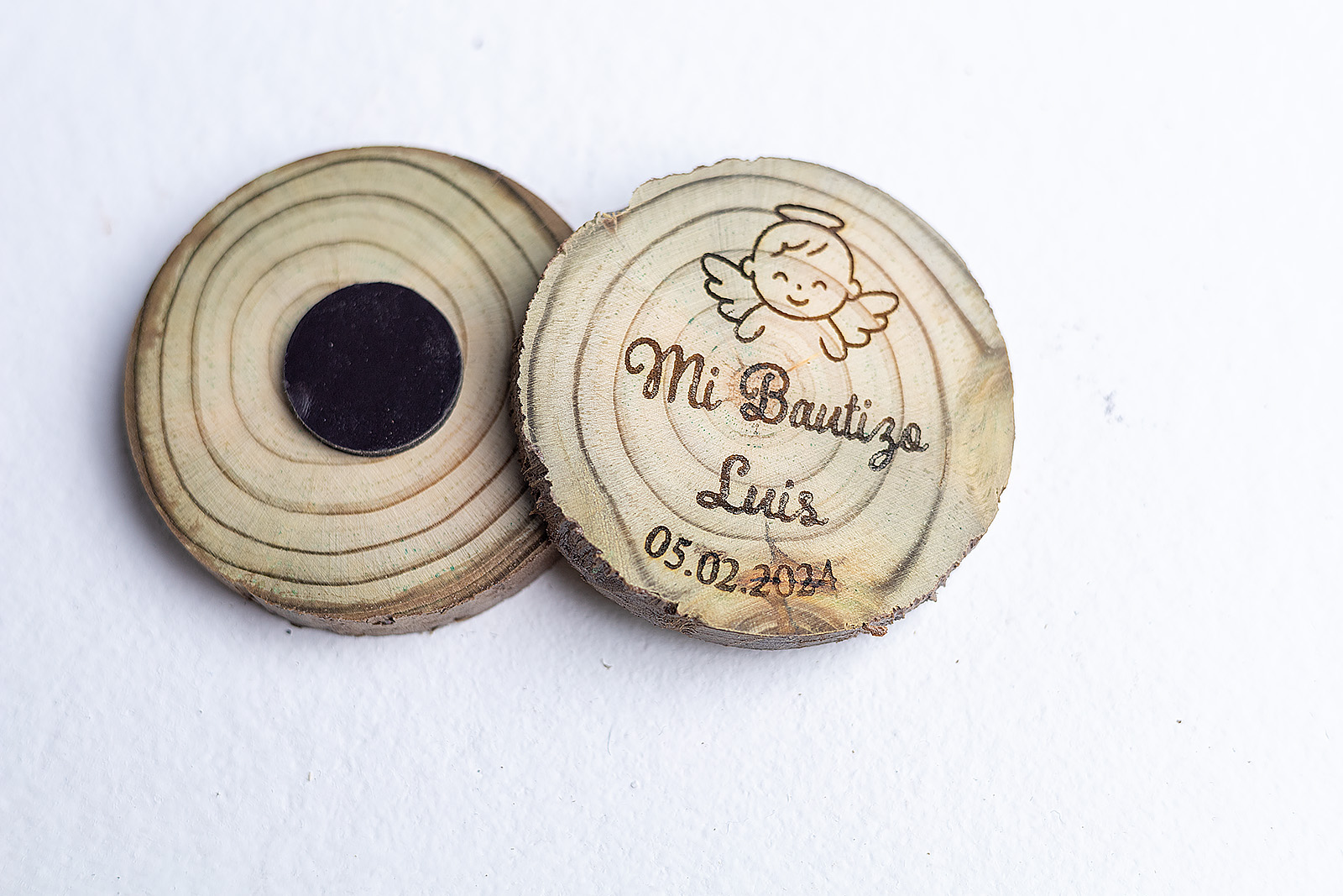 Un pequeño guardián para un gran día. Este imán es una rodaja de madera natural con corteza, grabada con la carita de un tierno Angelito y la frase «Mi Bautizo».