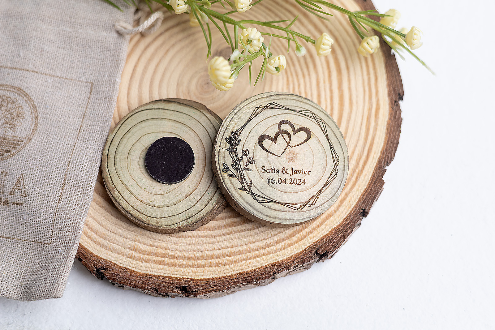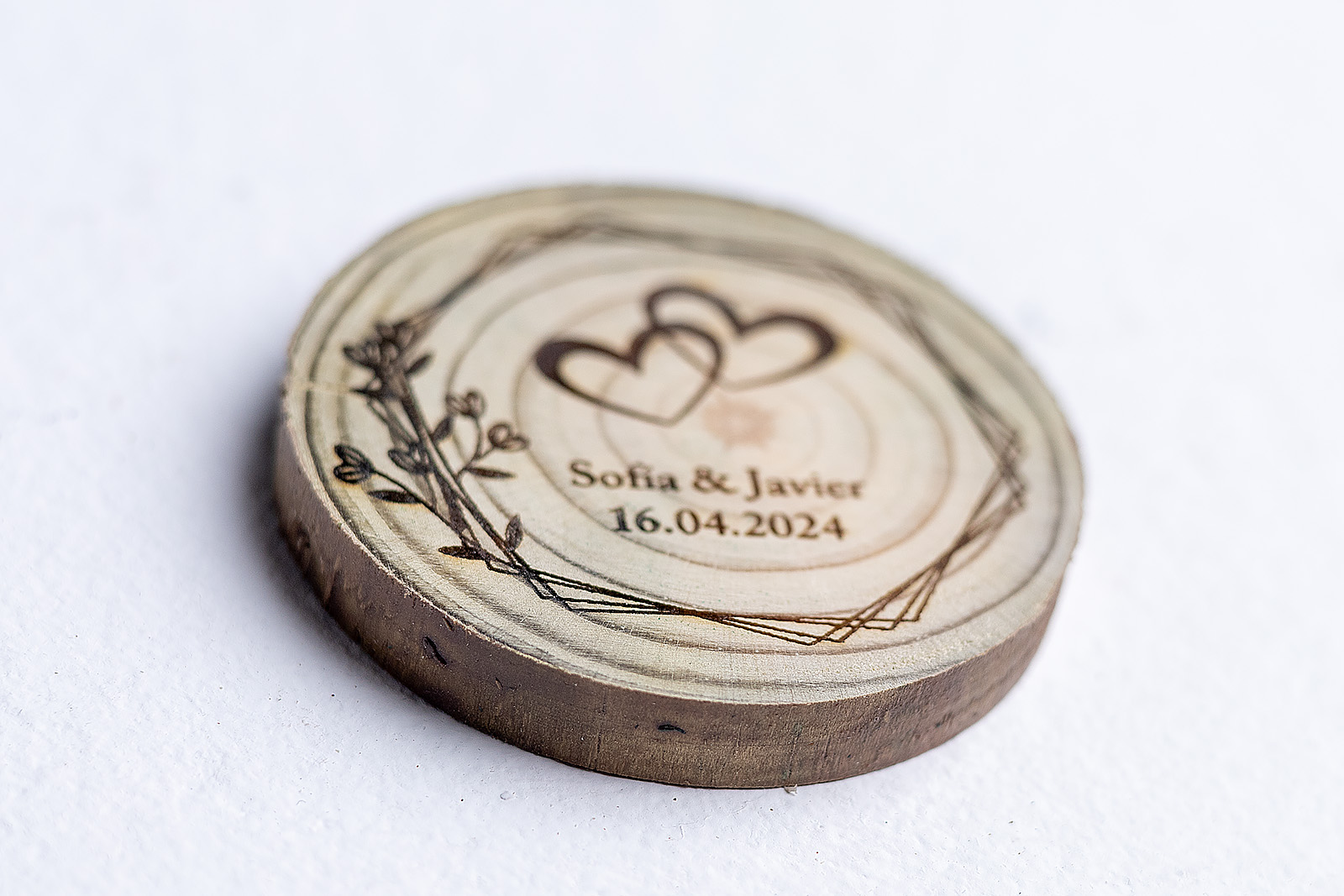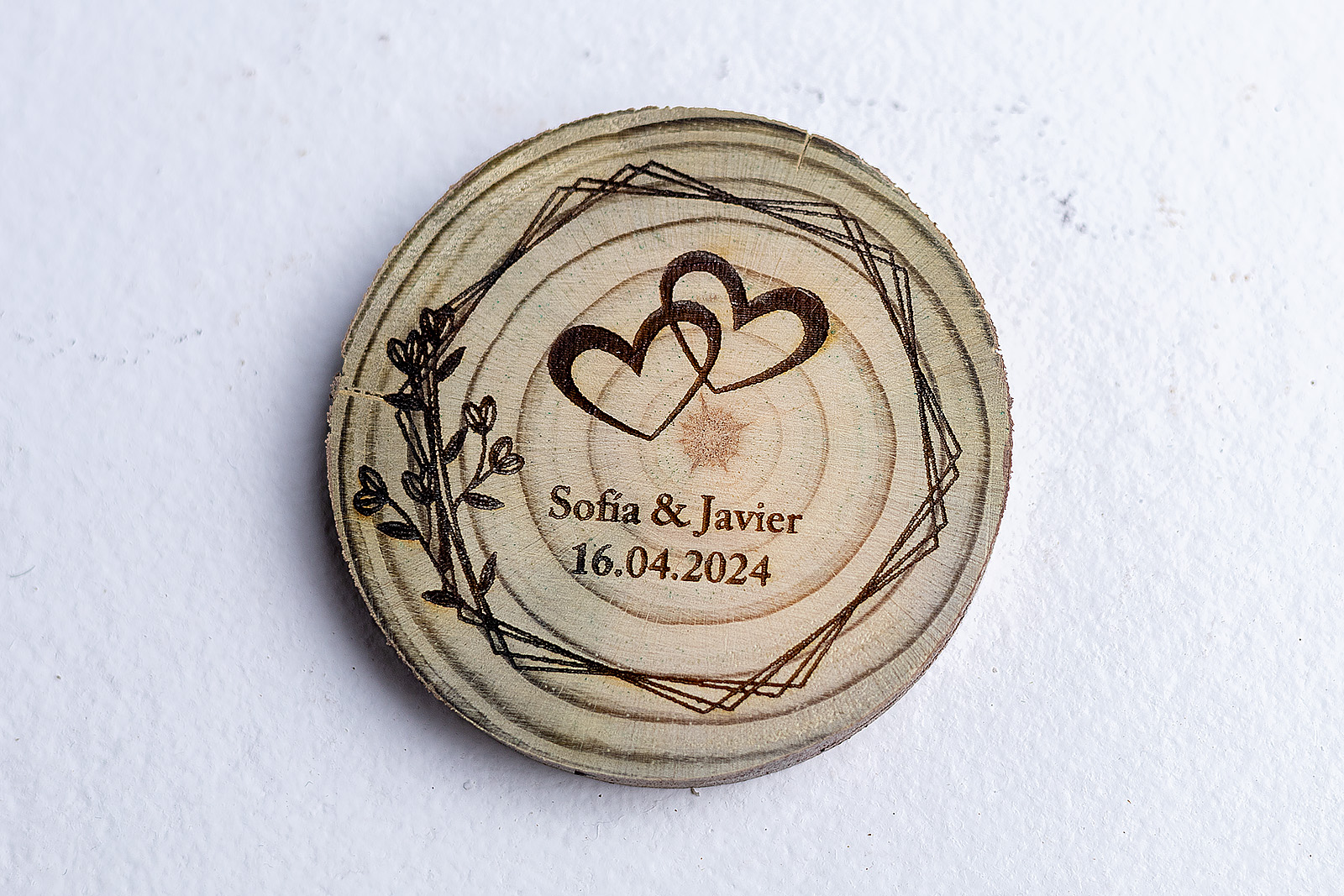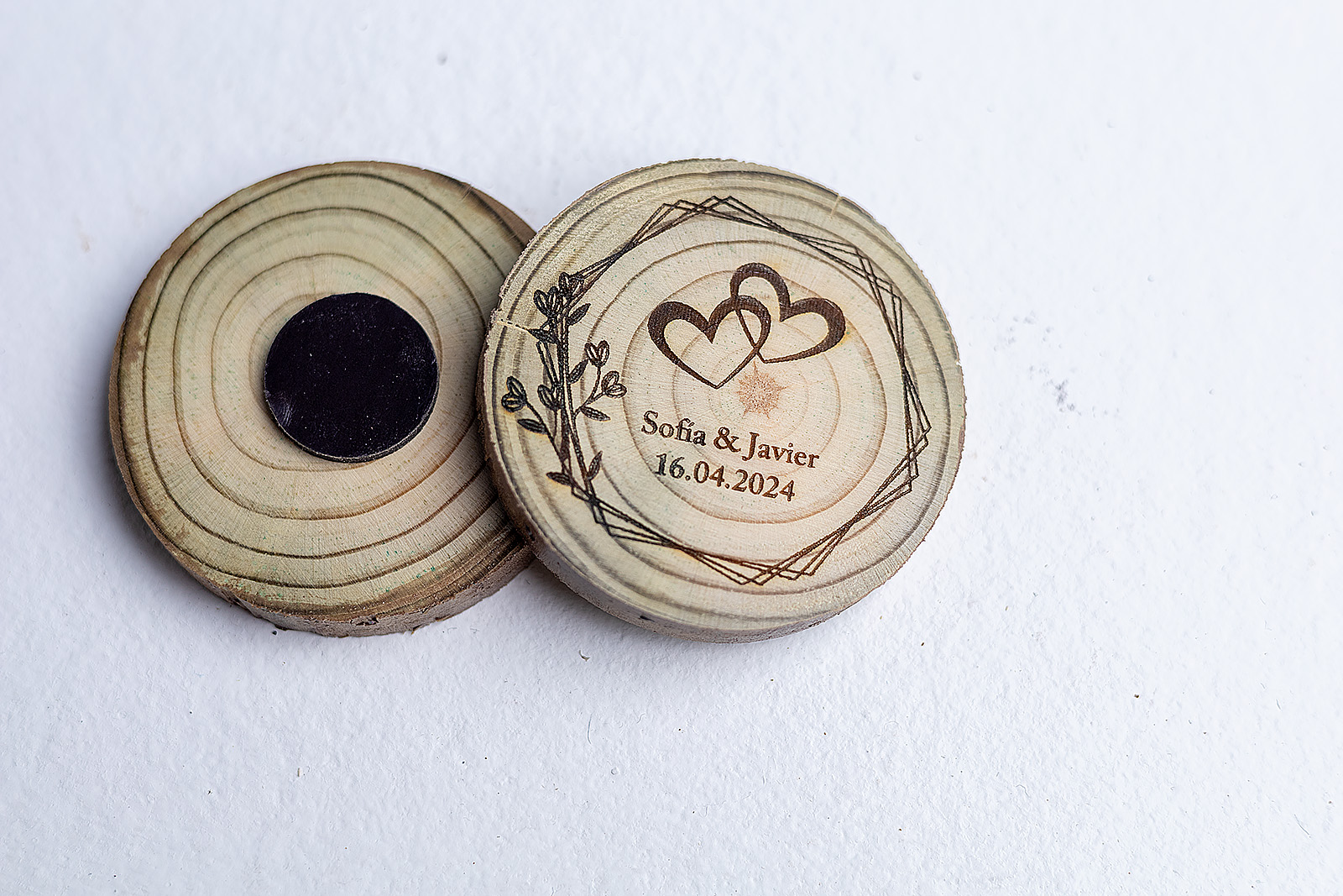 No hay dos historias de amor iguales, y tampoco hay dos imanes iguales en este modelo. Al utilizar rodajas de madera natural auténtica, cada invitado se lleva una pieza con su propia forma y corteza. El diseño combina la calidez de la madera con un grabado geométrico muy actual, creando un equilibrio perfecto entre tradición y modernidad.
