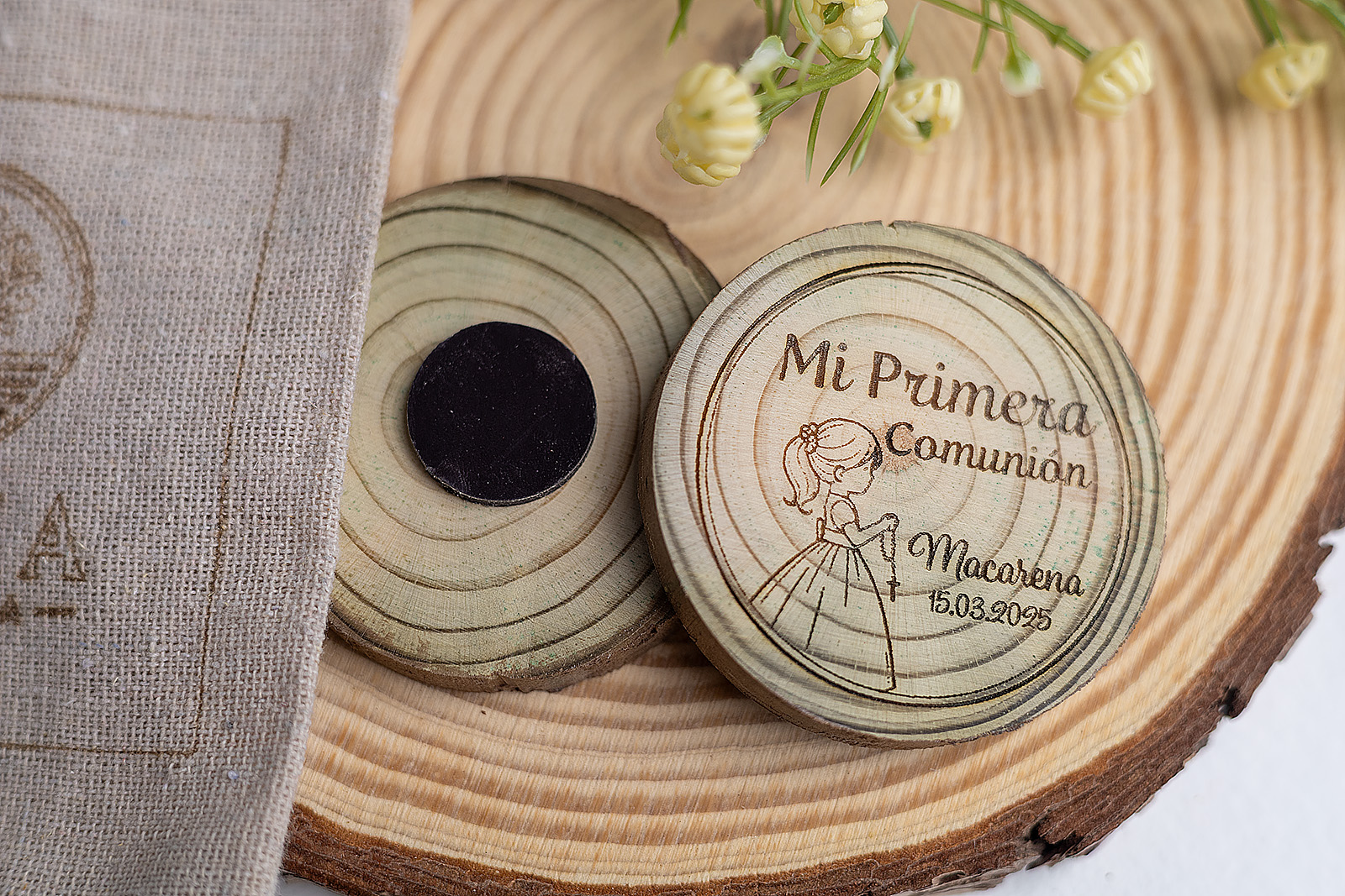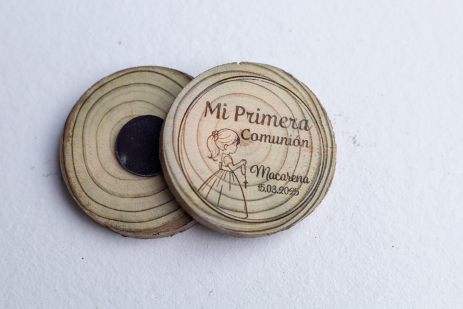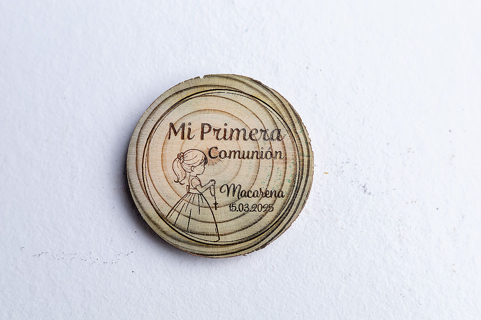 Este imán está pensado para ser un pequeño tesoro. El grabado de la niña con su vestido de comunión y el rosario en las manos representa la ilusión y la fe de este momento único en su vida. Al plasmarlo sobre una rodaja de madera auténtica, el recuerdo cobra vida con texturas y matices naturales que enamorarán a tus invitados.