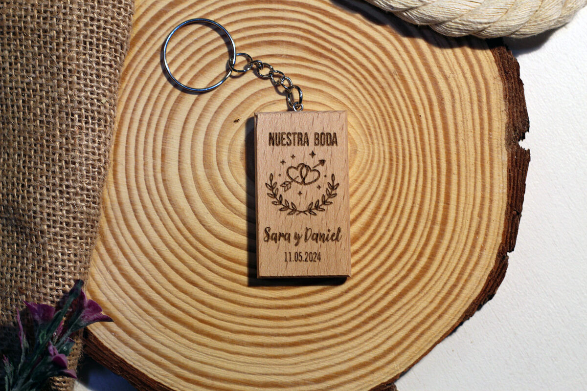 ¡Que viva el amor! Este llavero de madera maciza de Haya inmortaliza vuestro enlace con un diseño de corazones flechados bajo la frase festiva «NUESTRA BODA».