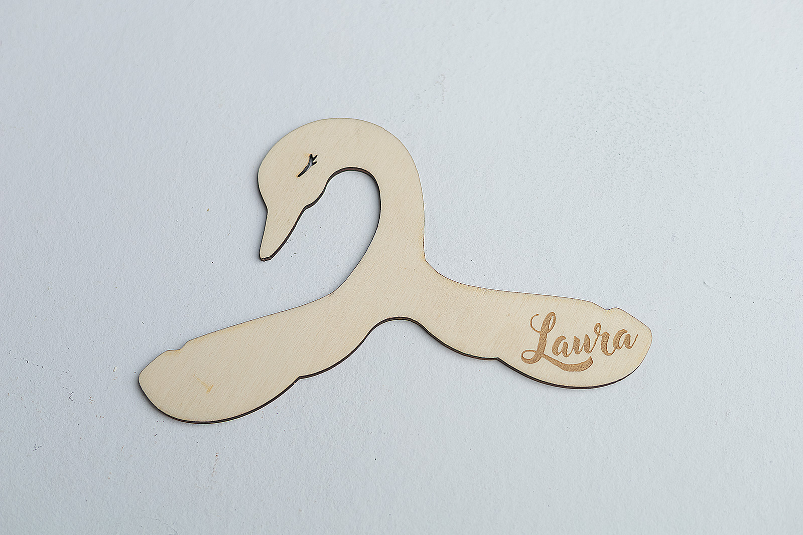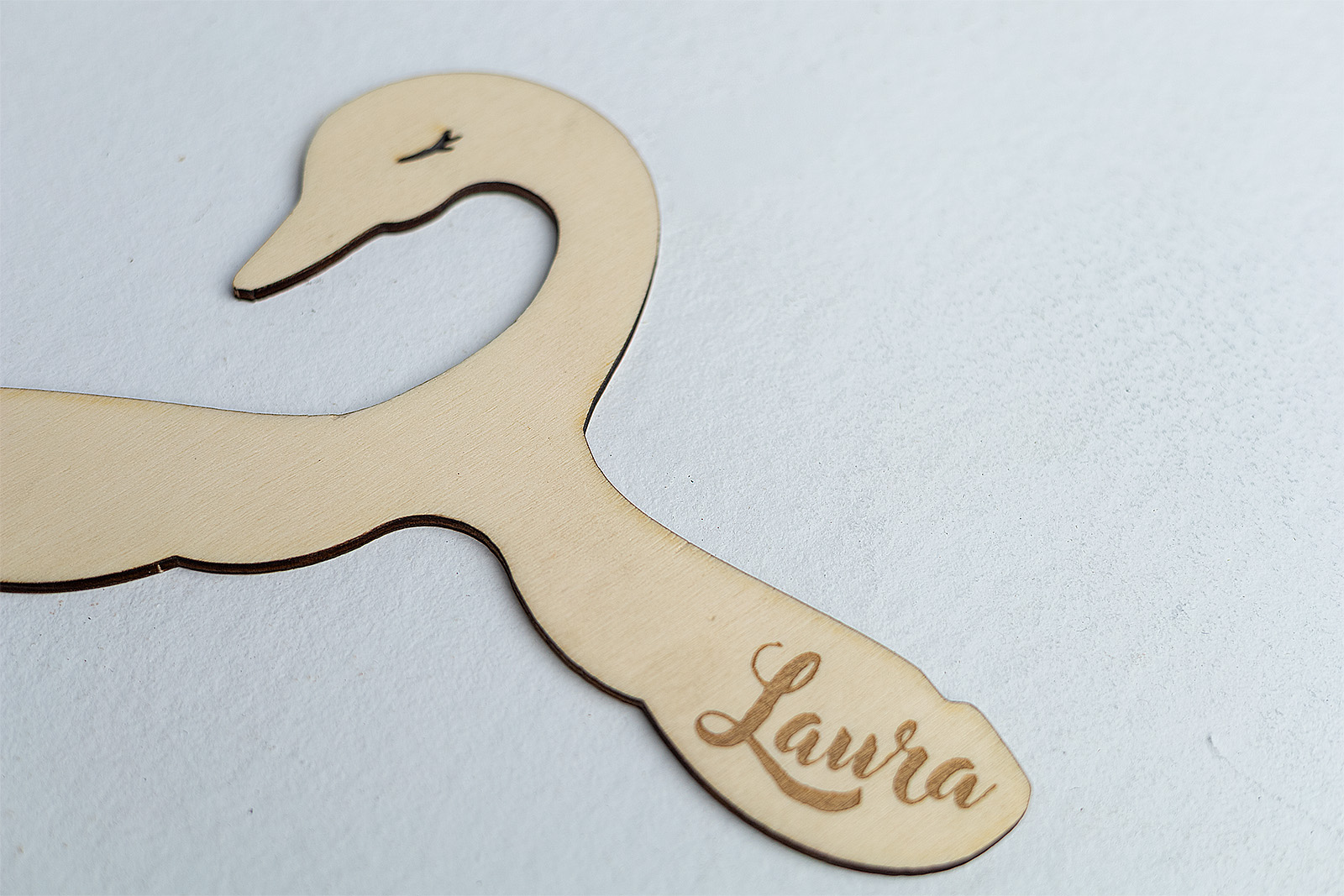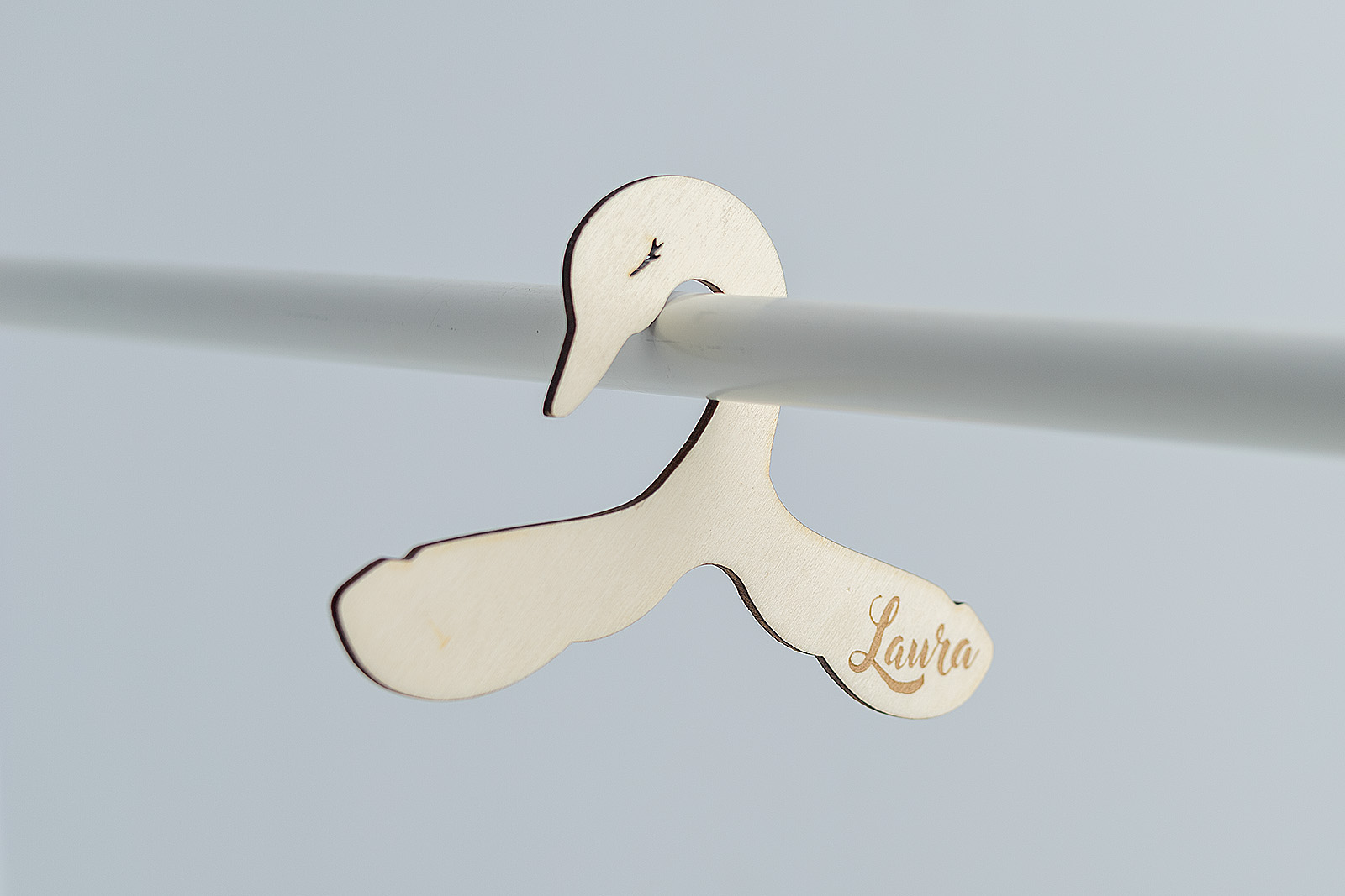 Pon un toque de magia y elegancia en su armario. Esta percha de madera infantil tiene una preciosa silueta de cisne y se personaliza con el nombre grabado a láser.
